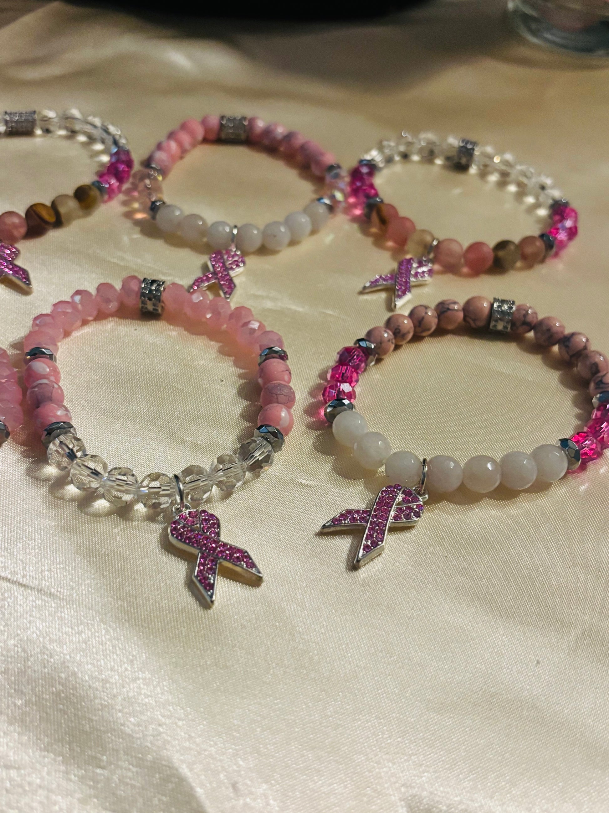 Assorted bracelets, pink breast cancer awareness rhinestone charm with assorted pink glass beads and gemstones